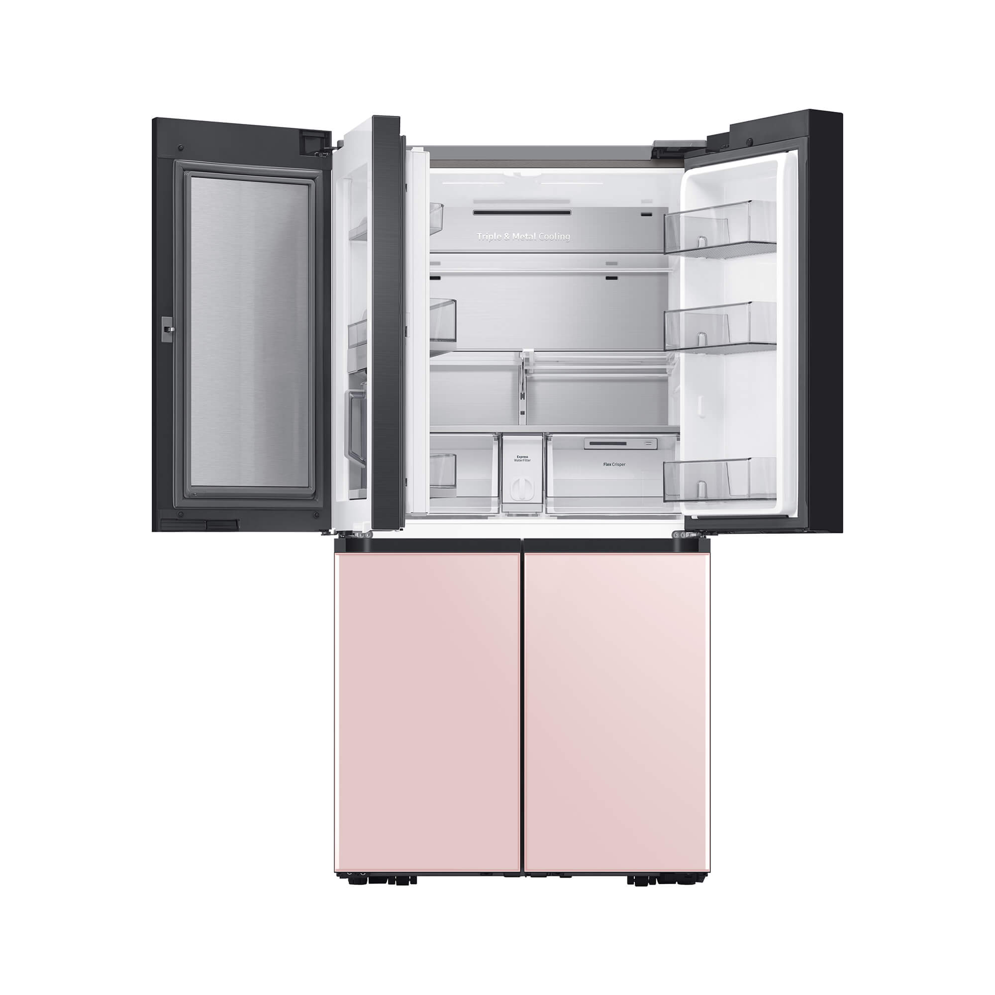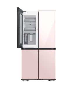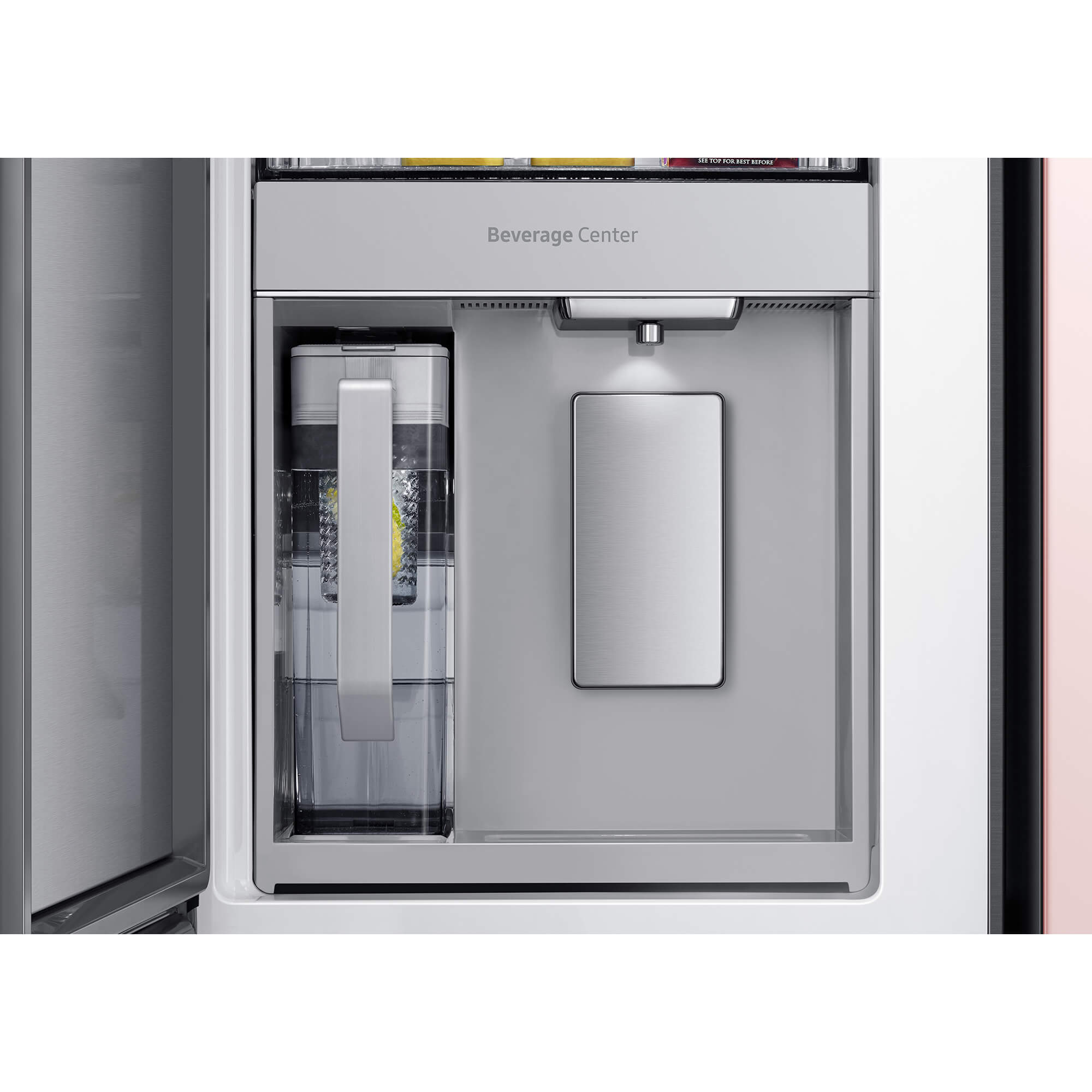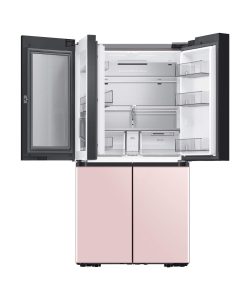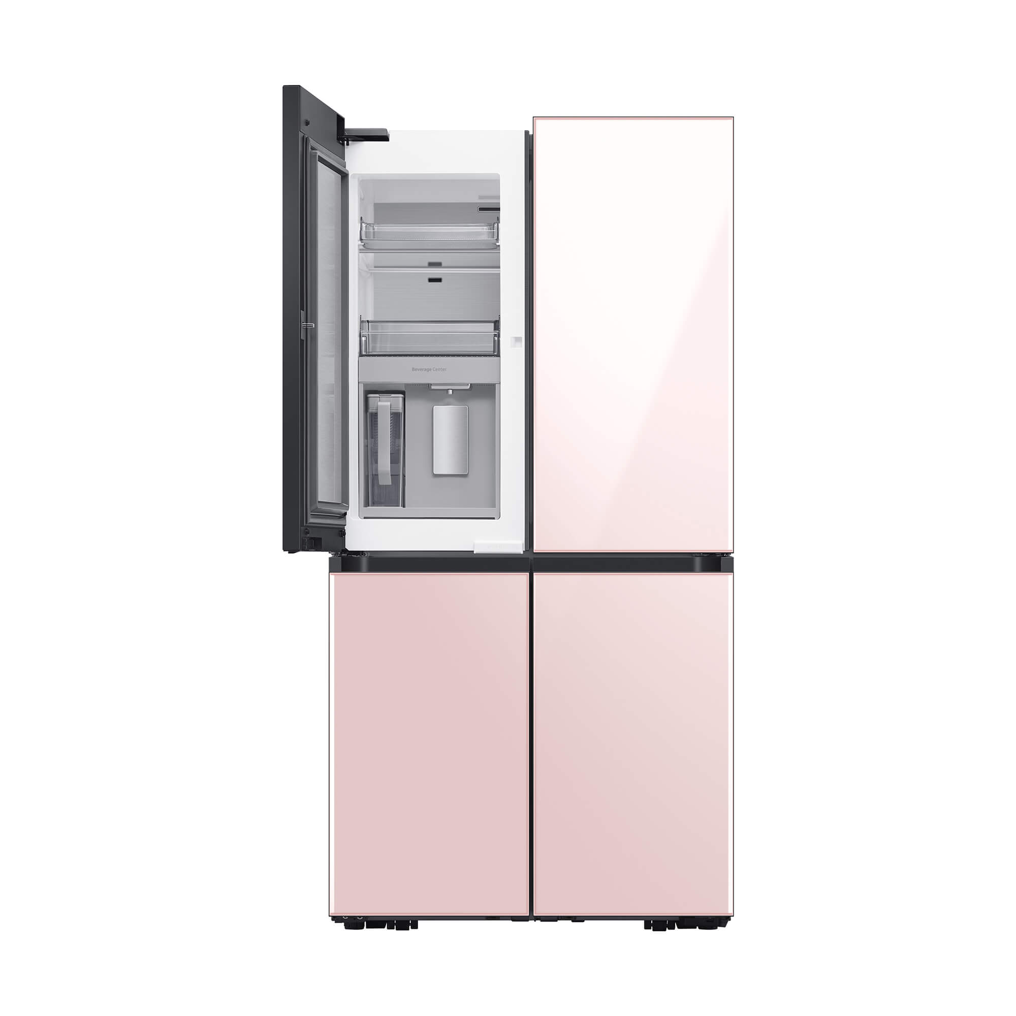 The colors on each of the 4 front panels of the Bespoke refrigerator alternate between the 8 options lined up at the bottom – Matte Black Steel, Champagne Steel, Navy Steel, White Glass, Rose Pink Glass, Navy Glass, Grey Glass, and Sky Blue Glass. Keep different foods fresh in optimal conditions. The FlexZone™ is an independently controlled compartment with five pre-set modes: Freeze, Soft Freeze, Meat/Fish, Fruit/Veggies and Beverage. There’s also a Flex Crisper for meat or fish and a Crisper+ for fruit and vegetables. Enjoy fast and easy access to refreshingly cold and flavored water. The Beverage Center™ has a BPA-free* Autofill Pitcher full of purified water, which can be infused with fruits and herbs, so it’s always ready to serve. And the Water Dispenser ensures you can quickly enjoy a cool drink.