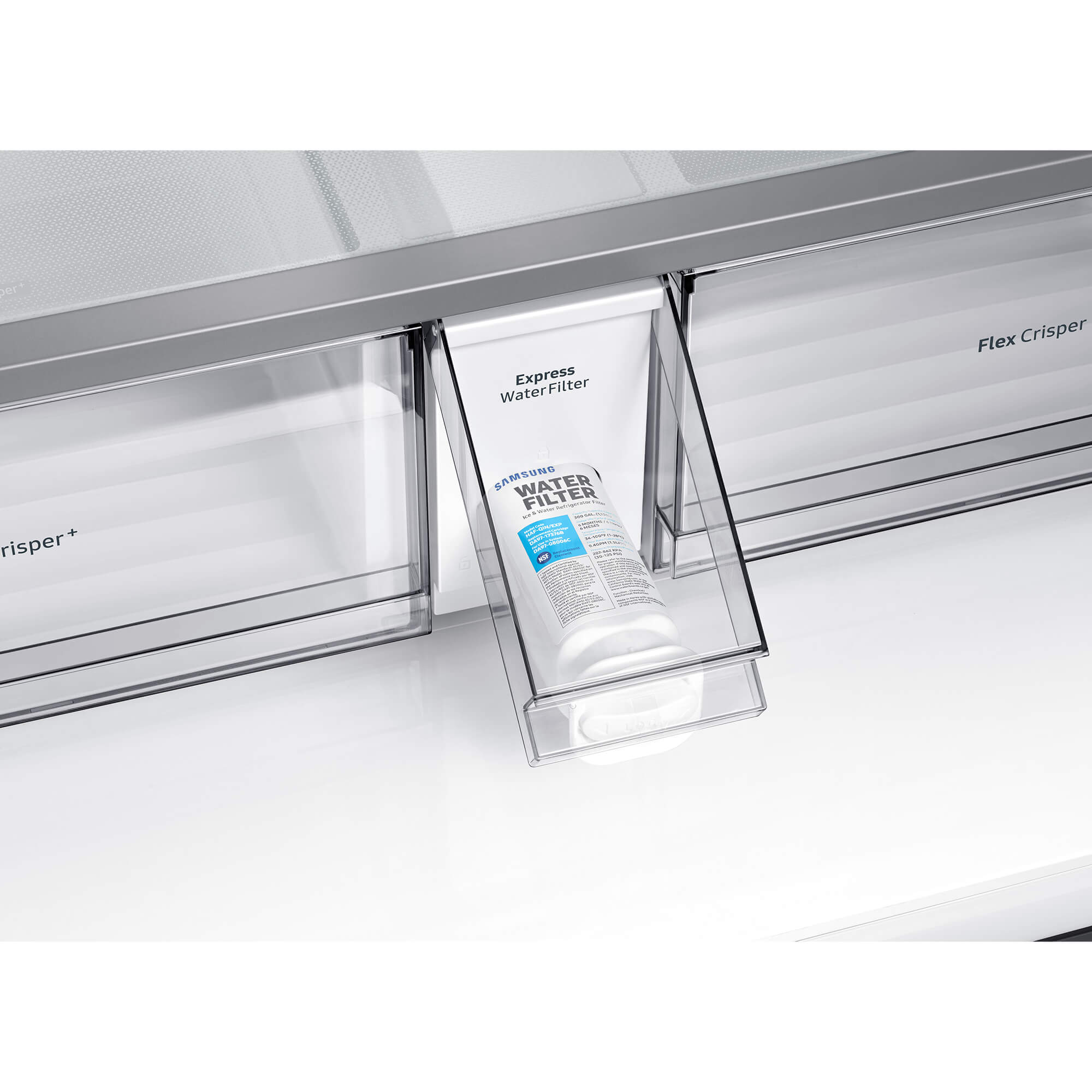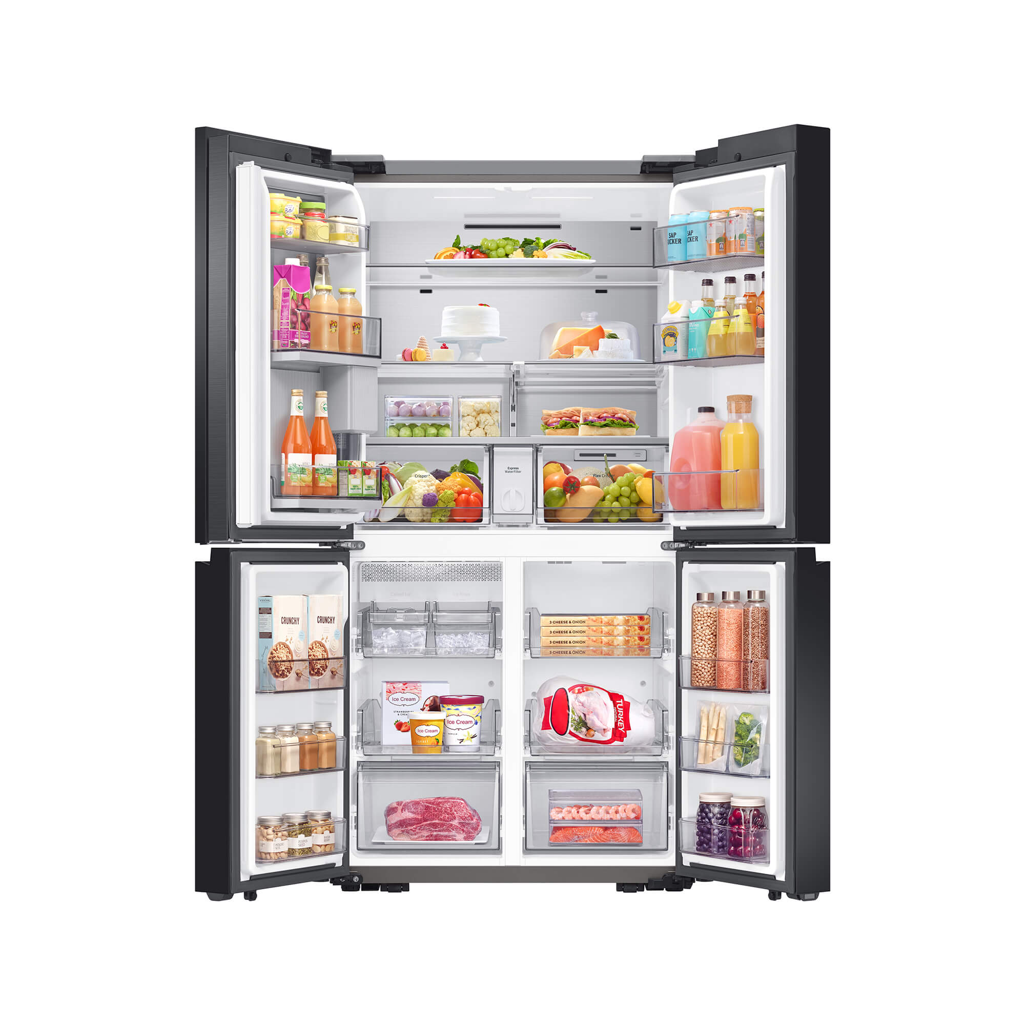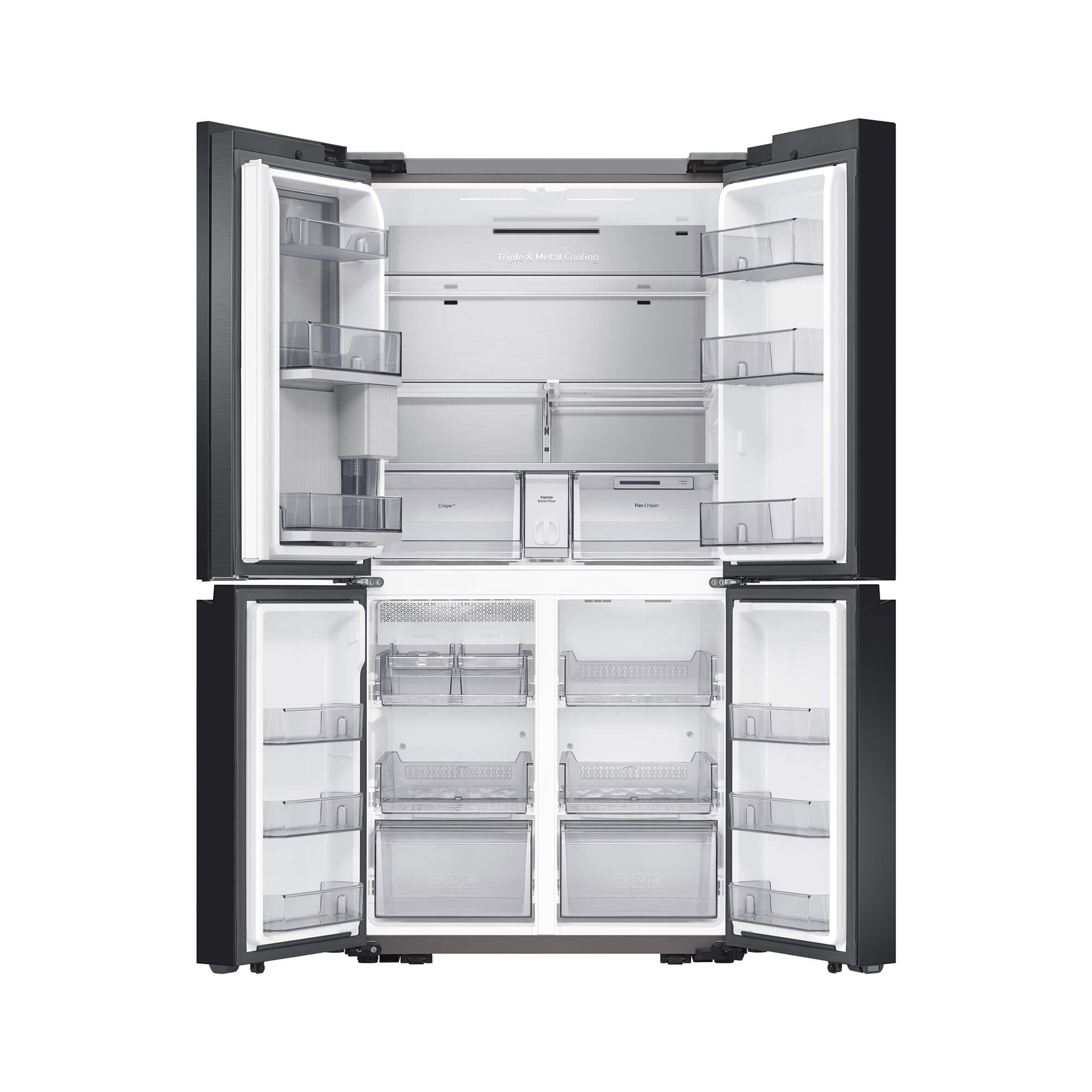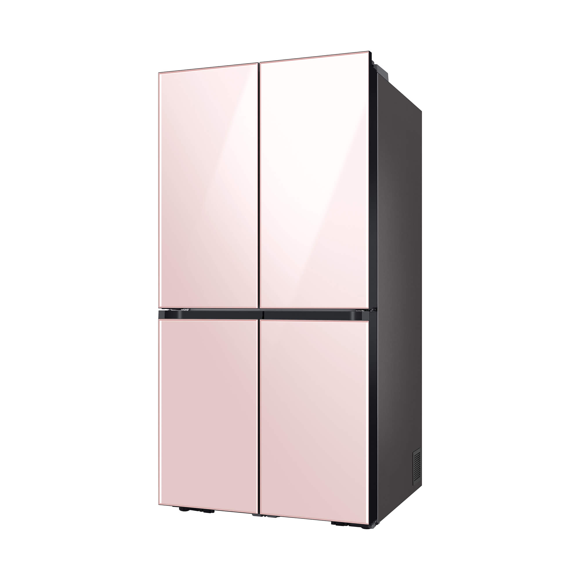 The colors on each of the 4 front panels of the Bespoke refrigerator alternate between the 8 options lined up at the bottom – Matte Black Steel, Champagne Steel, Navy Steel, White Glass, Rose Pink Glass, Navy Glass, Grey Glass, and Sky Blue Glass. Keep different foods fresh in optimal conditions. The FlexZone™ is an independently controlled compartment with five pre-set modes: Freeze, Soft Freeze, Meat/Fish, Fruit/Veggies and Beverage. There’s also a Flex Crisper for meat or fish and a Crisper+ for fruit and vegetables. Enjoy fast and easy access to refreshingly cold and flavored water. The Beverage Center™ has a BPA-free* Autofill Pitcher full of purified water, which can be infused with fruits and herbs, so it’s always ready to serve. And the Water Dispenser ensures you can quickly enjoy a cool drink.